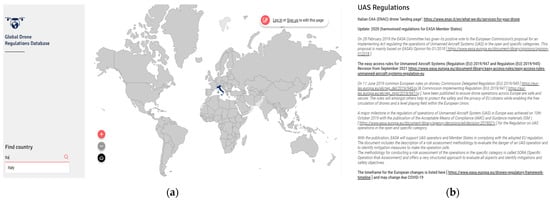 A WebGis listing the laws, regulations, and restrictions of each country can be found on the droneregulations.info website [66]. Indeed, the user can search by country or directly on the map (Figure 5a) and consult the rules in force in that country (Figure 5b).