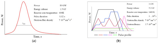 The main modes of IGR reactor operation are uncontrolled pulsed mode in Figure 1a (mode of self-quenching neutron burst, mode “Burst”) and controlled mode (mode “Pulse”) in Figure 1b.