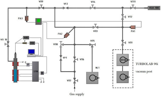 Figure 2. Scheme of experimental facility: NL 1—spiral pump; VP1…VP10—vacuum valves; PA1…PA3—pressure sensors; VF1, VF2—leakage valve; RGA 100—quadrupole probe/sensor (mass-spectrometer RGA-100); ABS—optical spectrometer; F—photo detector; OSC—oscilloscope; C—controller for pressure sensor; R—solid state relay for voltage regulation; P—converter of interfaces RS-485 <-> USB with galvanized isolation; ТРМ—two-channel regulator with universal input and RS.