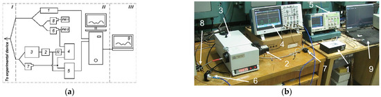 Figure 3. Optical system of facility: (a) scheme of optical recording system; (b) equipment for optical signal registration during calibration: 1—QE-Pro-abs optical spectrometer, 2—PMT module, 3—MDR-204 monochromator, 4—TBS2204B oscilloscope, 5—TPS2012 oscilloscope, 6—DET100A photo detector, 7—DET25A/M photo detector, 8—InGaAs photo detector, 9—PC for experimental data recording, PXI1, PXI2—system lines, technological control of IGR reactor.