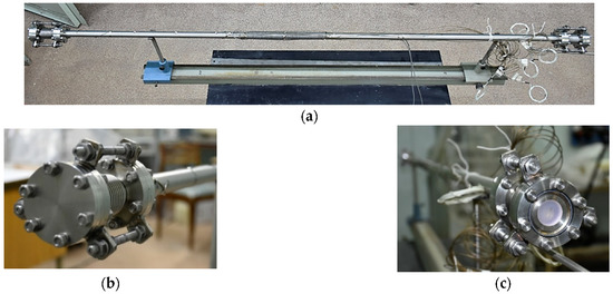 Figure 5. Irradiation device for experiments at IGR reactor: (a) ID assembled; (b) the lower aligner of ID with flange plug; (c) the upper aligner with vacuum window.