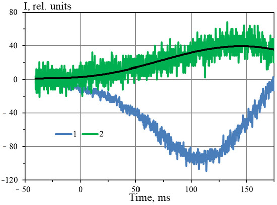 Figure 8. Oscillogram of PMT Signals, (1), and InGaAs Photodetector (2). Gas–argon under pressure of 305 Torr, and lithium layer temperature before reactor start-up is 710 K. The scale is expanded vertically in 104 for the line (2).