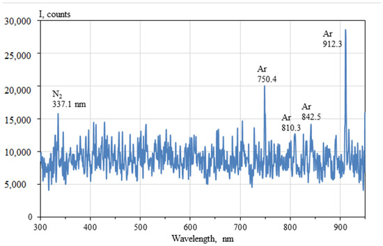 The argon emission spectrum is shown in Figure 7. The spectrum shows that two lithium lines predominate at 610.4 and 670.8 nm (Figure 7). The argon lines are at the background level. Optical radiation intensity vs. time curve (Figure 6) almost follows the reactor power vs. time with a shift of about 15–20 ms. It seems that the shift in time is explained by thermal radiation of the lithium layer due to the additional heating occurred under irradiation with thermal neutron flux and further cooling. Argon radiation pulse duration at 750.4 nm wavelength (≈95 ms, Figure 8) is slightly shorter than the duration of pumping pulse and the integral optical radiation flux in the sensitivity range of the Si-photodiode (Figure 6). Radiation maximum in the infrared area is also shifted by approximately 50 ms with respect to the maximum at 750.4 nm (Figure 8).