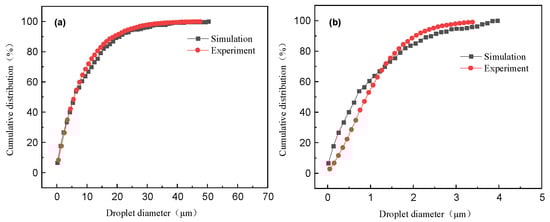 Comparison of droplet diameter distribution between experiment and simulation. (a) Droplet diameter distribution of spray 5 mm away from the nozzle exit; (b) Droplet diameter distribution of spray 80 mm away from the nozzle exit.