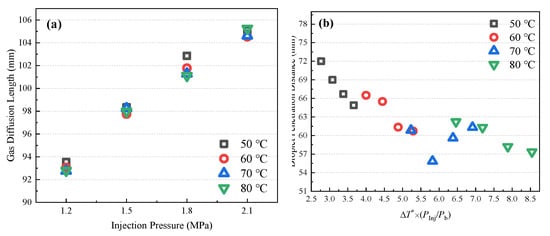 Variation of penetration distance with initial injection pressure and temperature. (a) gas diffusion length; (b) droplet penetration distance.