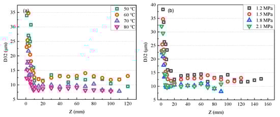 Effects of injection temperature and pressure on the variation of droplet D32 diameter along spray central axis. (a) Effect of Tinj on D32 variation under Pinj = 1.5 MPa; (b) Effect of Pinj on D32 variation under Tinj = 60 °C.