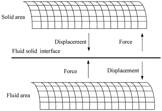 Figure 2 shows the schematic diagram of the force and displacement transfer relationship between the pipeline and fluid at the interface. Fluid-structure interaction occurs at the interface between fluid and pipe structure, where the physical quantity is transferred. The normal velocity (v) continuity, normal stress (τ) continuity, and displacement (x) continuity are expressed as