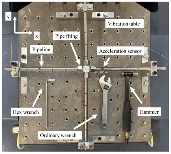 Modal analysis on the pipeline filled with fluid is carried out, and the experiment schematic is shown in Figure 6. The hydraulic hoses are connected with fittings on both sides of the x-axis as shown in Figure 3, the other directional branch pipe is plugged with plugs.