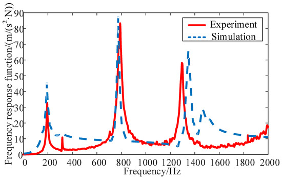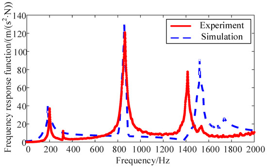 For the simulation analysis of hollow pipe modal and frequency response, the pipe section is divided by a hexahedral mesh of 2 mm in size. The joint and nut are divided by tetrahedral mesh of 4 mm in size, and the pipe is fixed and supported at all four ends. The results of the natural frequency obtained from the pipeline simulation and experiment are shown in Table 2. Figure 4 shows the comparison of FRF from the experiment and simulation. The simulation of the first three orders of natural frequency of the pipeline system match with the experimental results, the maximum error is under 7%, and the corresponding vibration pattern is shown in Figure 5. The reasons for that discrepancy include the accuracy of the instrument, the processing error of the pipeline, and the simplification of the four-way joint by the finite element model. Moreover, the acceleration sensor could add a small quantity of mass, and the additional mass of the longer part of the pipeline is not considered. Generally speaking, the experimental and the numerical results are in good agreement and, therefore, the accuracy of the proposed methodology was verified.