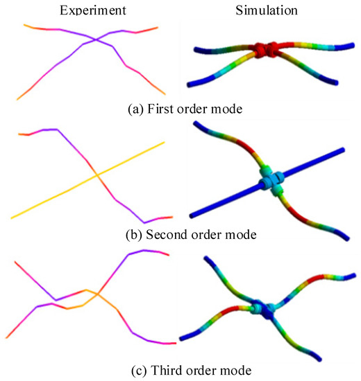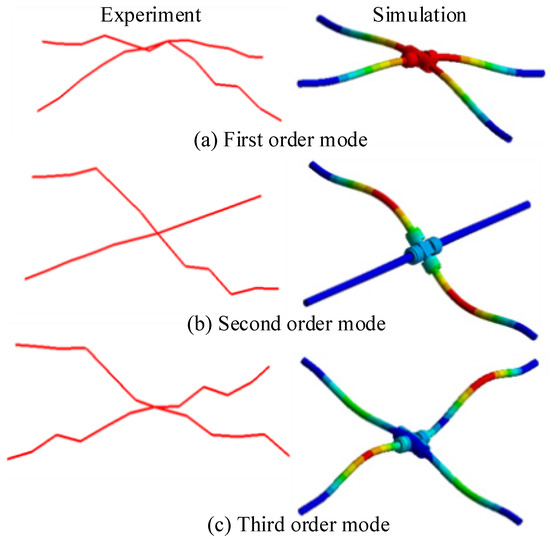 The comparison of the dynamic characteristics of the experiment and simulation is shown in Table 4 and Figure 7. The first three orders of natural frequency of the piping system from the experiment and simulation are similar, and the maximum error is under 6%. This is verified by comparing the mode shapes of the liquid-filled pipeline as shown in Figure 8. The reasons for that discrepancy include the accuracy of the instrument, the processing error of the pipeline, and the simplification of the four-way joint by the finite element model. Moreover, the acceleration sensor could add a small quantity of mass, and the additional mass of the longer part of the pipeline is not considered. Generally speaking, the experimental and the numerical results are in good agreement and, therefore, the accuracy of the proposed methodology was verified.
