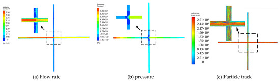Figure 9 shows that the fluid flow changes abruptly after passing through the joint. In the two curved parts, eddy currents are generated due to the collision between the fluid and the wall. Due to the shunting of the branch pipes, the flow rate decreases sharply after passing through the inner wall of the connection, and the flow direction of the fluid changes.