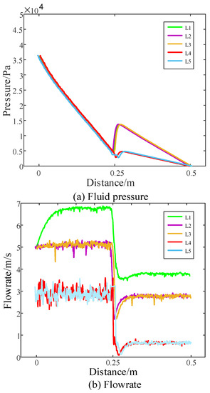 Figure 9 shows the flow rate, pressure and particle trajectories extracted along the central section of the pipeline. The inlet flow rate is 5 m/s, the pressure is 7 MPa, and the fluid is 46# hydraulic oil. Five lines are extracted along the pipeline section, and the schematic diagram of the extraction position is shown in Figure 10.