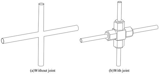 To analyze the joint effect on the fluid-structure interaction, multi-branch pipelines with and without a joint are analyzed as shown in Figure 12. The calculation iteration step is set as 0.001 s, and each step is iterated 10 times. The two-way fluid–structure interaction simulation analysis is carried out.