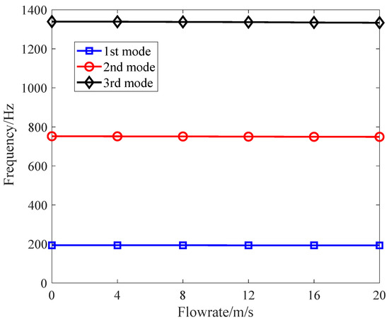 When the fluid pressure is set at 2 MPa, the flow rate is set at 0, 4, 8, 12, 16, and 20 m/s for analysis. Table 5 shows the first three-order natural frequencies of the pipeline at different flow rate. Figure 15 shows that the first three-order natural frequencies of the pipeline at different flow rates. The first three-order natural frequencies of the pipeline decrease continuously with the increase in flow rate, but the frequencies of each order under different flow rate are relatively close, and the change is not obvious. The first three-order natural frequencies have changed by 0.26%, 0.4%, 0.43%, respectively. The effect of the flow rate on the pipeline is due to the pressure difference caused by the variation in flow rate.