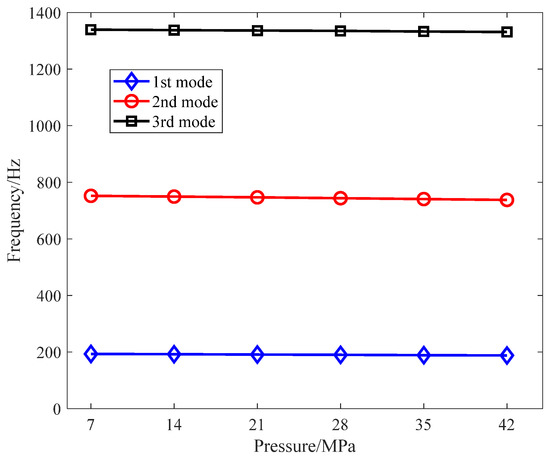 When the flow rate is set at 5 m/s, the fluid pressures are set at 7, 14, 21, 28, 35, and 42 MPa for analysis. Table 6 shows the first three-order natural frequencies of the pipeline at different pressures. Figure 16 shows that the first three natural frequencies of the pipeline gradually decrease with the increase in the fluid pressure. The first three-order natural frequencies are changed by 2.85%, 1.9%, and 0.62%, respectively. The influence of pressure on pipelines cannot be ignored in practical engineering analysis.