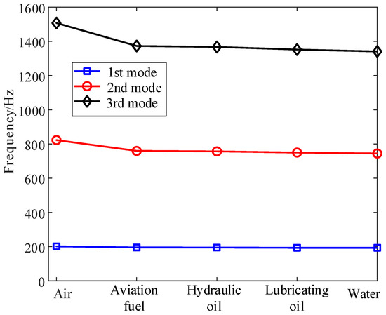 Table 7 shows the parameters of different fluids. In order to explore the effect of different fluids on the natural frequency of the pipeline, different fluids (air, aviation fuel, hydraulic oil, lubricating oil, water) are investigated.