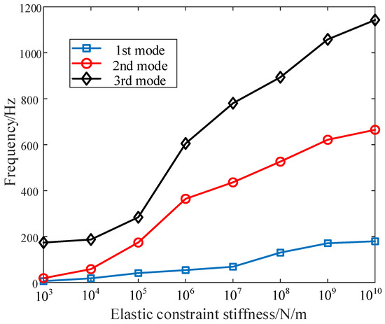 The fixed constraint of the pipeline is changed to elastic constraint. Different restraint stiffnesses (103, 104, 105, 106, 107, 108, 109, 1010 N/m) are applied. Table 10 shows the first three natural frequencies of the pipeline at different constraint stiffness. Figure 19 shows that with the increase in restraint stiffness, the first three-order natural frequencies of the pipeline gradually increase. When the stiffness is less than 105 N/m, the pipeline is less constrained, resulting in a slow increase in the natural frequency. The elastic constraint gradually approaches the fixed constraint when the stiffness increases to 109–1010 N/m. At this point, the increase in the natural frequency becomes slow and gradually approaches the value of the natural frequency at the fixed constraint. Within this constraint stiffness range, The first three-order natural frequencies change by 2803.88%, 3374.03%, and 556.29%, respectively. When elastic restraint is applied to the pipeline, appropriate restraint stiffness shall be selected on the basis of avoiding resonance.