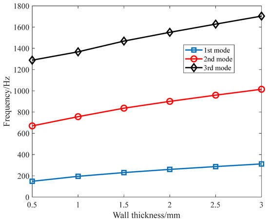 The tube inner diameter is set at 10 mm. The wall thickness of the pipe is adjusted by changing the outer diameter (0.5, 1, 1.5, 2, 2.5, 3 mm). Table 12 shows the first three natural frequencies of the pipeline at different wall thicknesses. Figure 21 shows that the natural frequency of the pipeline increases with the increase in wall thickness. When the wall thickness increases, the equivalent stiffness and equivalent mass of the piping system increase. If the increasing trend of the equivalent stiffness is greater than that of the equivalent mass, this makes the natural frequency of the whole piping system increase. The first three-order natural frequencies change by 110.31%, 51.44%, and 24.35%, respectively. The selection of the pipeline should be based on the objective situation to select the appropriate wall thickness of the pipeline.