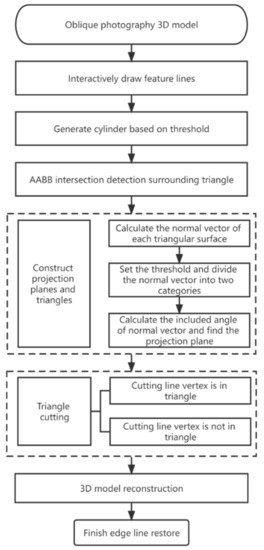 For the edge line restoration method described in this paper, we first drew the target edge line, constructed an outer cylinder for the target edge line, and used the AABB (axis-aligned bounding box) to carry out collision detection on the model, which can exclude a large number of triangular patches that do not intersect with the model. Then, we set the cutting surface by combining the triangular surface with the edge line, and cut the continuous triangular network that intersected with it. Finally, we constructed a layered LOD (levels of detail) to complete the edge line restore. Figure 1 is a flow chart of edge line restoration using an oblique photography 3D model as the input data.