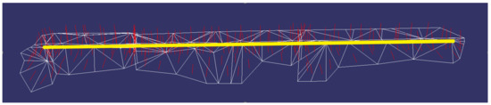 First, we calculated the normal vector of each triangular surface and observed that it could be roughly divided into two categories near the edge line. As shown in Figure 3, the yellow line was the feature line drawn interactively, and the local relevant triangles that were searched according to the intersection method described in Section 2.1 were white triangular nets, while the red line was the normal vector of each triangular surface.