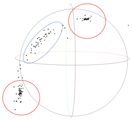Distribution of triangle normal vectors in three-dimensional space. Normal vectors in the red circles are the centralized distribution, and normal vectors in the blue circle are discrete distribution.