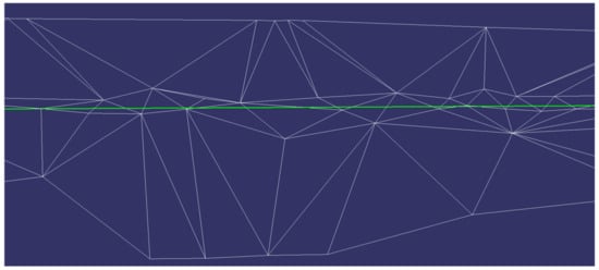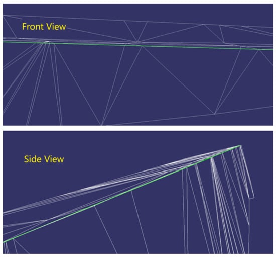 Through the above two plane normal vectors, the direction of the angular bisector was taken as the normal vector of the projection plane, and the projection plane was tangential to the hand-drawn feature line. We projected local triangles and feature lines onto the projection plane. As shown in Figure 6, it can be seen that the triangles were distributed in a network, and there were no mutually superimposed triangles or discontinuous triangles. Therefore, the problem of triangle self-intersection caused by direct straightening was solved.