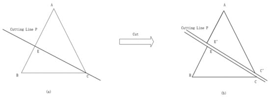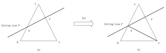 When the cutting line passed through the vertex of a triangle and intersected with an edge of the triangle, the intersecting part was clipped as follows. As shown in Figure 8, it was calculated that the intersection of the cutting line P and the edge ab of △ABC was point E, connecting the line segment CE. Line CE divided △ABC into two triangles: △BCE and △AE′C′, as shown in Figure 8b. The geometric properties of the triangular patches were maintained, and the topological relationships among the triangular patches were established.