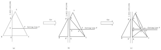 In the cases where the vertex of the cutting line did not exist in the triangle, in order to ensure the accuracy of cutting, we used the above method to cut the triangle perpendicular to the cutting line and through the straight line of the vertex, and then used the cutting line to cut the triangle on one side of the cutting line for a second time. As shown in Figure 9, we first made the auxiliary line L perpendicular to the cutting line P through the vertex O, and then calculated that the intersection points of the auxiliary line L and the edges AB and BC of △ABC were point D and point E, respectively, connecting the line segments DE and CD. The line segment CD divided the quadrilateral ADEC generated by cutting into △ADC and △DEC, as shown in Figure 9b. Then, we used the cutting line P to cut △ADC and △DEC, as shown in Figure 9c. The geometric properties of the triangular patches were maintained, and the topological relationships among the triangular patches were established.