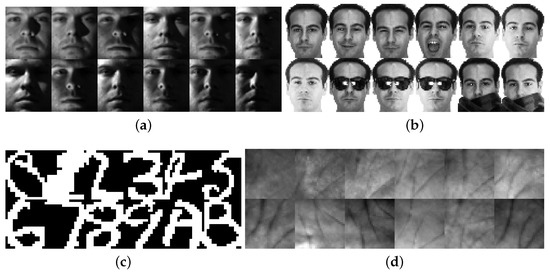 The Binary Alphadigits database consists of 1404 binary images from 36 classes, with 39 images per class. The images are handwritten digits and letters. Specifically, this database contains digits “0” through “9” and capital letters “A” through “Z”. The image size is 20 by 16. This database can be downloaded from http://www.cs.nyu.edu/~roweis/data.html (accessed on 30 September 2018).