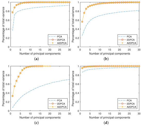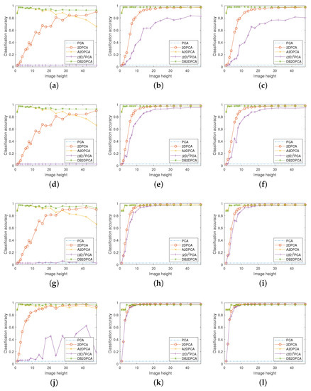 In the first column of Figure 10, the accuracy of 2DPCA generally increases with image height and the accuracy of A2DPCA generally decreases with image height. The reason is that 2DPCA projects the rows of images onto its projection matrix while A2DPCA projects the columns of images onto its projection matrix. As a result, the number of features extracted by 2DPCA increases with image height and the number of features extracted by A2DPCA decreases with image height. More features generally indicate higher classification accuracies, especially when the percentage of total variance explained by these features is small. Therefore, the accuracy of 2DPCA generally increases with image height and the accuracy of A2DPCA generally decreases with image height in the first column of Figure 10. This is not the case in the last two columns since the reordering and reshaping effect dominates these results.
