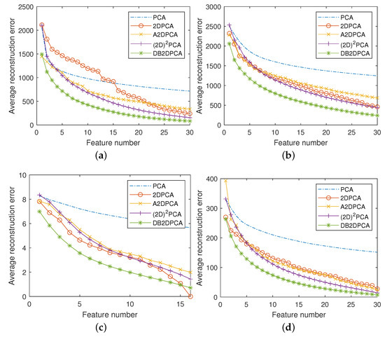 where denotes the Frobenius norm. The reconstruction result of PCA is shown in Equation (5). It should be further reshaped into a matrix in order to obtain the corresponding reconstruction image . For the four 2D algorithms, i.e., 2DPCA, A2DPCA, and DB2DPCA, their definitions of are shown in Equations (9), (13), (15) and (17), respectively. Note that for the two bilateral algorithms, the same number of features are extracted from both laterals.