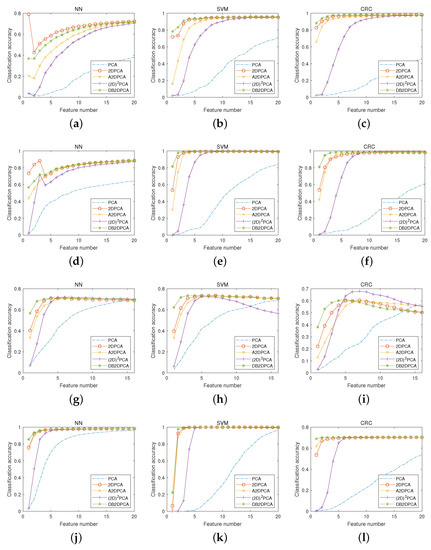The experiments corresponding to the four rows in Figure 10 differ in the preset value. Generally speaking, the classification accuracies increase with increasing value; this is due to the fact that the number of extracted features increases when the percentage of total variance explained by these features—i.e., the value—increases. Having more features leads to better classification performance, especially when the percentage of total variance explained by these features is not large enough, e.g., smaller than 0.95. Therefore, the classification accuracies increase with increasing value.