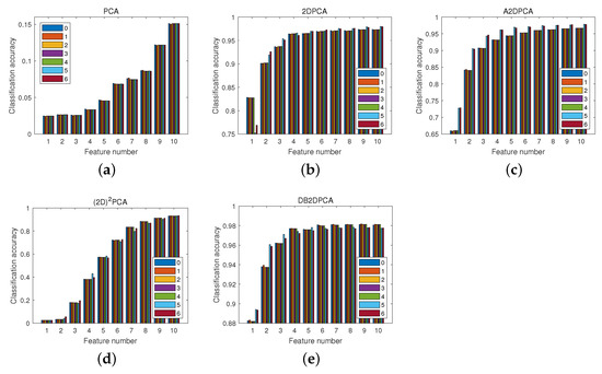 Figure 10 exhibits the classification performances of the four 2D algorithms only when . Based on symmetries of these algorithms, their classification performances when can be directly inferred. Let c be an arbitrary divisor of d; then, 2DPCA with approximates to A2DPCA with , with approximates to with , and DB2DPCA with approximates to DB2DPCA with . Consequently, we can further conclude that DB2PCA can achieve the best classification performances among the five competing algorithms when the image height p is in the full range of .