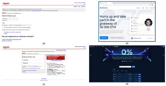 Some examples of malicious and legitimate webpages: (a) a phishing Rakuten website; (b) a fake cryptocurrency website; (c) a legitimate Rakuten website; (d) a legitimate cryptocurrency website.