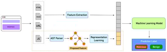 Starting with an input of a webpage, we can extract all of its features, such as HTML, images, the URL, and the JS code. Then, we preprocess all features to represent each one numerically. To enrich the features, we add one more process that makes a semantic representation of the JS code based on the AST-JS structure. Using the JS content that we already have, we first parse the JS code dataset to obtain the AST representation for each JS file. This first output is in the form of JSON format files containing all the JS AST representation information. Next, we construct the graph structure of the AST information. We assume each syntactic unit as a single graph node and each edge as a hierarchical relationship between two syntactic units. We use graph2vec [11], a representation learning model, to create a low-dimensional representation of the AST-JS graph. After that, we combine our representation with other feature vectors to create a complete webpage representation. Then, we can use any machine learning model to predict whether it is malicious or benign.