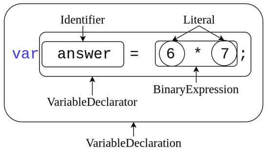 We start with the JS code file in Listing 1. We can then parse each statement from top to bottom to break it into smaller source code components. We have to check the syntactic category to which the code belongs. For example, in Listing 1, the first code line is a “VariableDeclaration” object consisting of one “VariableDeclarator” object. This object has two main properties: “BinaryExpression” and “Identifier”. For binary expression, we will have two literal values, 6 and 7, as the property of that object. Figure 4 depicts how we can parse one line of JS code into an AST.