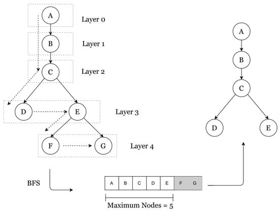 Furthermore, we cannot reduce the number of AST graph nodes randomly. We need to choose nodes that are “safe” to remove without compromising our purpose. We use a breadth-first search (BFS) tree algorithm to select nodes for removal. BFS refers to the method in which we traverse a graph by examining all children of a node before moving on to that child’s children Figure 5. The BFS algorithm visits all graph nodes that traverse the graph layerwise, thereby exploring the neighboring nodes. As we can see, BFS provides a layerwise algorithm that fits our problem. The AST graph has a top-down structure in which the parent nodes sufficiently represent the child nodes under the parents. We can consider the bottom node as the top node’s detailed information, described by the node type.
