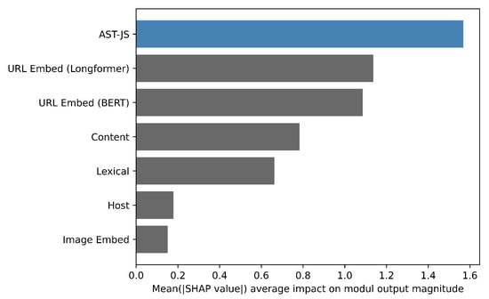 Figure 6 reports the absolute mean SHAP values for two datasets, showing that AST-JS contributes much to the prediction output. It can be observed that the proposed feature, AST-JS, has a clear influence on producing the predicted labels. AST-JS is one of the top three feature categories in the whole dataset that mixes webpages with and without JS information. This result is understandable because in the whole dataset, we found that around 60% (60,939) of webpages do not have AST-JS features. This condition may influence how AST-JS contributes more to malicious code detection. This also reveals that URL information is a critical feature for achieving higher performance in malicious webpage prediction when we cannot find JS content.