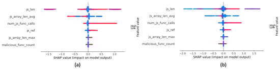Two summaries of SHAP values: (a) full dataset; (b) dataset containing only JavaScript code.