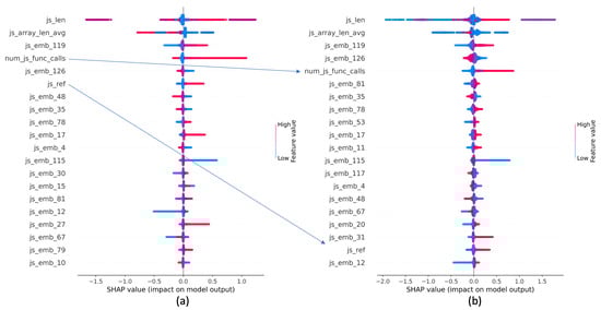 Top 20 features based on SHAP values: (a) full dataset; (b) dataset containing JavaScript code.
