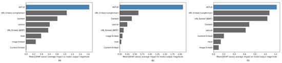 Total average SHAP values for (a) cluster 0, (b) cluster 1, and (c) cluster 2.