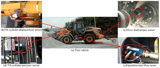 Before the test, the onboard PC, the five-wheel instrument, the data acquisition instrument, the rear drive shaft torque signal receiver, the front drive shaft torque signal receiver, and other test instruments should be checked to ensure they can work well. The above experimental apparatus is installed in the driver’s compartment, and its installation position is shown in Figure 3. At the same time, attention should be paid to not having excess material on the shoveled path to avoid errors in the data measured by the measuring device of real-time displacement. The measuring device for real-time displacement is installed at the rear of the loader to measure the real-time displacement and speed of the loader. As shown in Figure 4, the driven wheel follows the real-time rotation of the loader, the gear plate on the rotating shaft follows the real-time rotation of the driven wheel, and the rotational speed sensor on the gear plate can measure the real-time displacement and speed of the driven wheel. Due to the real-time rotation of the driven wheel following the loader, the real-time displacement and velocity of the whole vehicle are equal to the real-time displacement and velocity of the driven wheel.