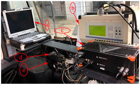 Installation position of test instruments: a. onboard PC, b. five-wheel instrument, c. data acquisition instrument, d. rear driveshaft torque signal receiver, e. front driveshaft torque signal receiver.