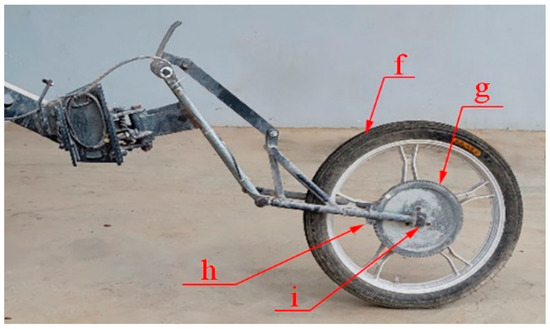 The measuring device of real-time displacement: f. driven wheel, g. gear plate, h. rotational speed sensor, i. rotating shaft.