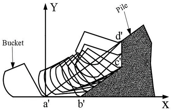 As shown in Figure 7, the parallel shoveling trajectory has three phases, the ab interval is the horizontal insertion phase, the bc interval is the shovel digging phase, and the cd interval is the lifting phase. The shoveling cross-section S consists of the surface profile of the stockpile and the bucket tip curve. According to our previous deduction inside the literature [27], The curve equation of the bucket tip can be defined as: