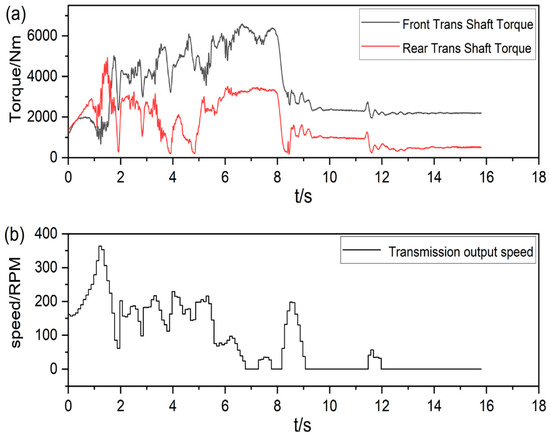 (a) Torque of the front drive shaft and torque of the rear drive shaft; (b) transmission output speed.