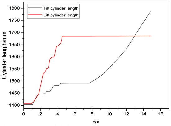 The energy consumption of the oil cylinder is generated by the work performed by the cylinder’s expansion and contraction. It is equal to the product of the extension length of the cylinder and the force on the cylinder. The cylinder displacement is measured by the pressure sensor, as shown in Figure 13, and the cylinder pressure is measured by the pressure sensor, as shown in Figure 14. The calculation formula for the energy consumption of the lift cylinder is: