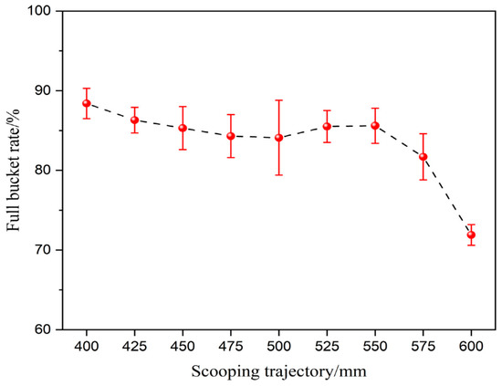 Substituting the measured shoveling weight, the density of gravel, and the porosity into Equation (6), the full bucket rate of the wheel loader for automatic shoveling according to nine shovel trajectories is shown in Figure 16, except for the trajectory with a parallel shoveling depth of 600 mm, which has the lowest full bucket rate of 70.6% and cannot meet the actual operation requirements. The full bucket rate of the rest of the shovel trajectory was between 80% and 90%, which met the actual requirements. Among them, the full bucket rate of the trajectory with a parallel shovel depth of 400 mm is the highest, with a full bucket rate of 88.4%.
