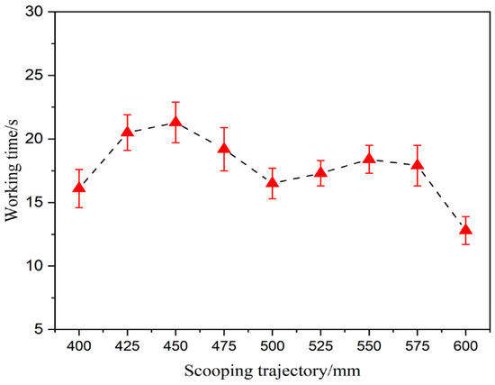 The automatic shoveling working time of the loader is shown in Figure 17. The trajectory with a parallel shovel depth of 600 mm had the lowest operating time of 12.8 s. Since the full bucket rate could not reach the requirement, the operation time of the remaining trajectories was between 16.1 and 21.3 s after excluding the trajectory with a parallel shoveling depth of 600 mm. The working time of the trajectory with parallel shoveling depths of 400 mm and 500 mm is 16.1 s and 16.5 s. The working time of the trajectory with parallel shoveling depths of 425 mm and 450 mm is higher, all reaching more than 20 s, and the working time of the rest of the trajectory is between 17 s and 20 s.