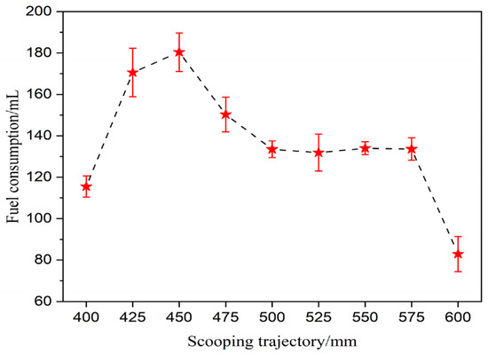 The operating fuel consumption is shown in Figure 18. After excluding the trajectory with a parallel shoveling depth of 600 mm, the operating fuel consumption of the trajectories with parallel shoveling depths of 425 mm, 450 mm, and 475 mm is higher, the highest reaches 180.4 mL, the lowest is 115.5 mL for the trajectory with a parallel shoveling depth of 400 mm, and the operating fuel consumption of the other trajectories is 130–134 mL.